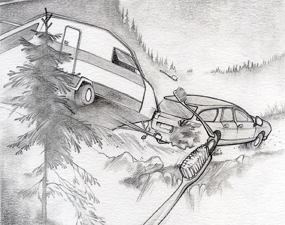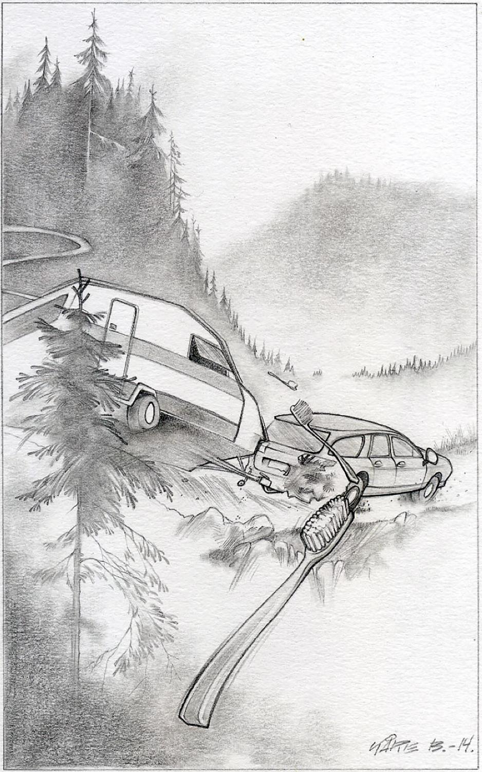 Så bar det i vei. Et par smell inne fra vogna indikerte at ei løs plate over komfyren hadde tatt seg en tur på egenhånd. Men slikt kan ikke stoppe en ekte caravanist som er ute på sin aller første kjøretur. Nå gjaldt det å fin-navigere; først forbi ei kraftmast og siden en veranda, men så gikk det «raka vägen».