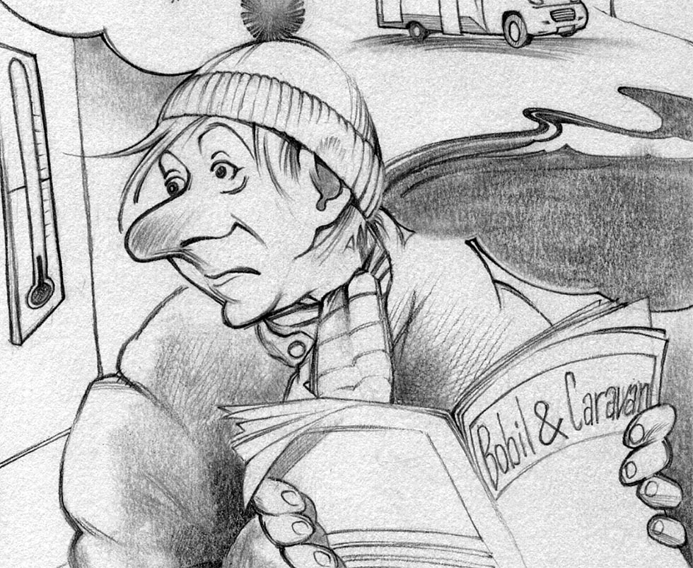 Det er kaldt i vogna når vi kommer nå. Riktignok står det en liten lunk på for å beholde noen få plussgrader inne, og med det holde fukten borte. I tillegg gjør en fuktbolle fra Biltema god nytte for seg. Det var ett av de mange gode tipsene fra den forrige eieren – en erfaren caravanist.