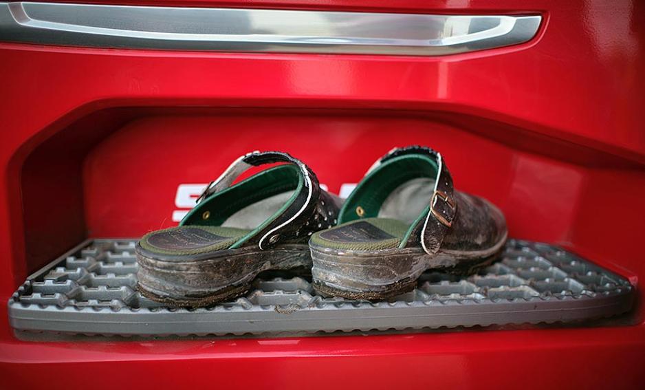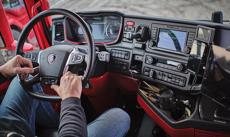 Gjermund tar godt vare på arbeidsplassen sin. Sko skal etterlates på utsiden når en klatrer inn i førerhuset fylt av farger, ledlys, lydanlegg, paddinger, skinntrekk på gulvet. Alt dette og mer til, dette er en livsstil.