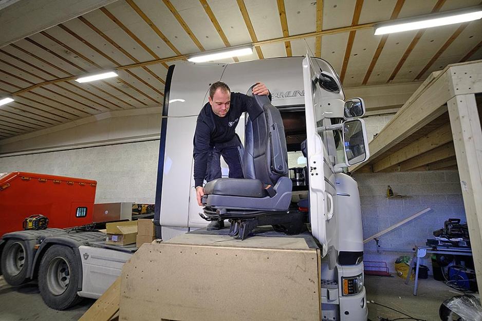 – Nå innreder vi én ny lastebil i uken. Det er veldig populært, så vi har for tiden fire måneders ventetid, smiler en travel Henjo mens han demonterer setene i en helt ny Scania.