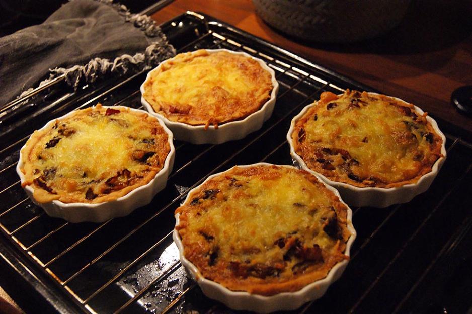 - Smuldre smøret i melet og tilsett vann. Bruk gjerne en matprosessor. Trykk deigen ut i en paiform eller i porsjonsformer. Prikk paibunnen med en gaffel og stek den i på 200 °C i ca. 15 minutter, til den ser gyllenbrun og sprø ut.