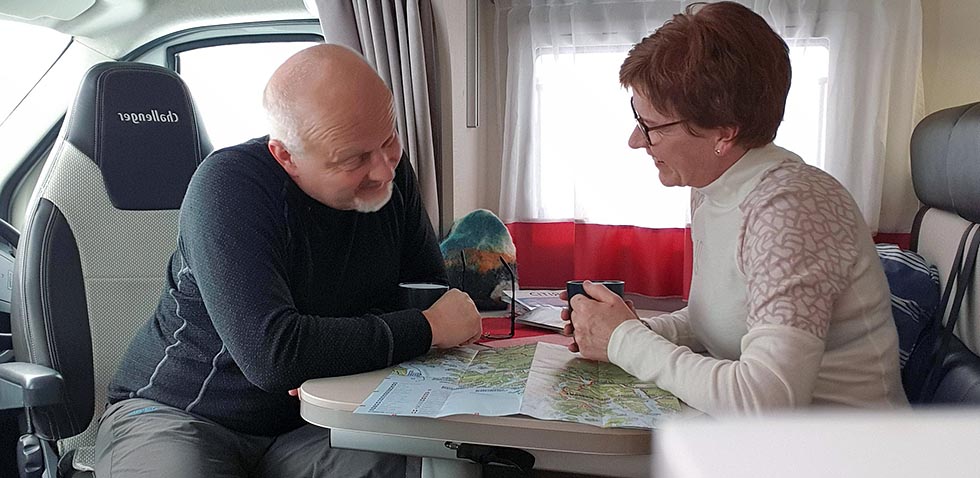 Etter en behagelig flytur landet vi på Tromsø lufthavn, som var preget av tett snødrev. Litt mye snø - selv for lokalbefolkningen - ga ekstra ventetid i taxikø, før vi kom til Tromsø by og bobilforretningen iCaravan. Der fikk vi utlevert en halvintegrert Challenger med oppredd seng og det vi ellers trengte av utstyr. På vei ut døra fikk vi forsikringer om at "selv om været er ille, så holder bobilen". Med de ordene var vi klare for å begynne på vår drømmetur.