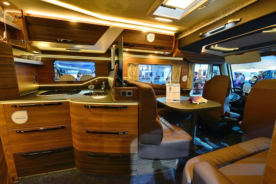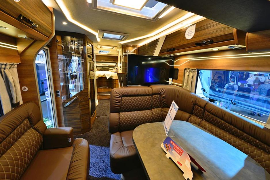 Caravan Salon 2020: Den ni meter lange bobilen er rikelig utstyrt, og har et unikt interiør som i stor grad er preget av mørke toner. Da er det godt at det er rikelig med lys ombord.