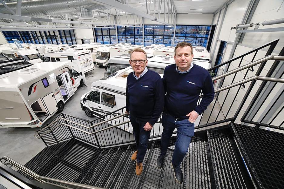 Daglig leder Petter Pedersen (t.v) og selger Rune Røinås kan vise frem sine bobiler og vogner i flotte, nye lokaler.