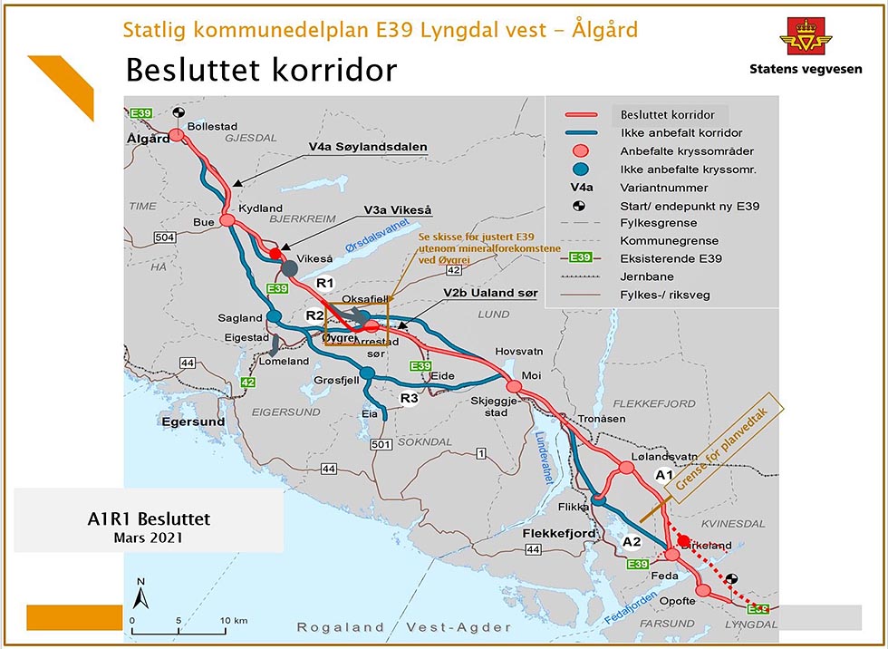 Regjeringen har valgt korridor for ny E39 mellom Lyngdal og Ålgård. Løsningen blir det såkalte R1-alternativet som går sør for Teksevatnet og via Vikeså gjennom Rogaland, og A1-alternativet via Lølandsvatn gjennom Agder. Denne løsningen har størst samfunnsøkonomisk nytte, og er best for natur og jordvern i Rogaland, hevder regjeringen i en pressemelding til Din Fritid.