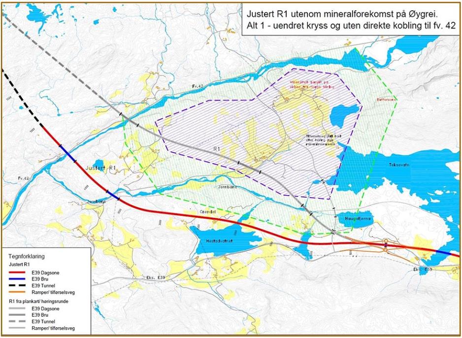 For å unngå konflikt med mineralressurser av nasjonal og internasjonal betydning i Øygrei-området i Eigersund og Lund kommuner, skal veien legges utenom dette området. Det innebærer justeringer i en strekning på rundt 5 kilometer i R1-alternativet. Dette blir en oppgave for Nye Veier i arbeidet med reguleringsplanen.