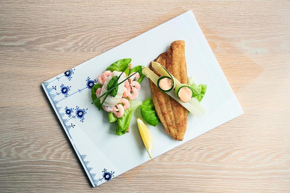 Smørrebrød med panert fisk og reker