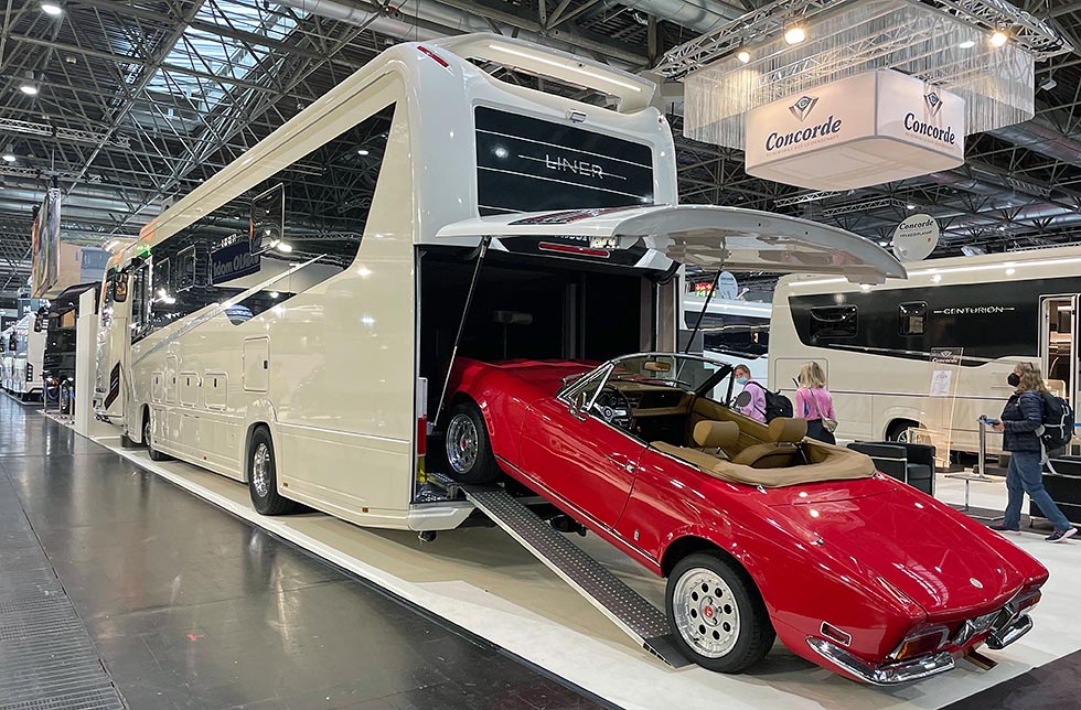 En av forskjellene på vår hjemlige Caravanmesse og Caravan Salon, er at du på sistnevnte har utallige ekvipasjer du neppe har sett før, og sannsynligvis aldri heller kommer til å se igjen. Det er lett å la seg fascinere av bobiler som er store nok til å by på garasjeplass til en veteranbil, som her hos Concorde!