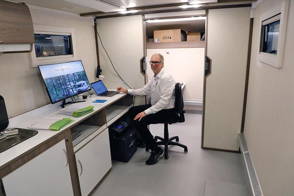 Svenske Nordic produserer spesialbygde bobiler, og har levert alt fra kontor til helsestasjoner på fire hjul. På Caravanmessen fant vi daglig leder av fabrikken i Sverige, Stefan Tanskanen, i det han brukte den utstilte bobilen til nettopp det den var tiltenkt: Et rullende kontor.