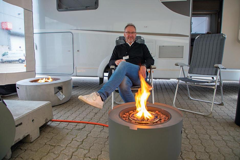 I gangen mellom hall B og C fant vi Inge Knutsen. Her hadde han rigget seg til med stand i luftige omgivelser. Man kunne da kanskje tro at det var kaldt og surt, men ikke når man selger varmende peisbord. Inge kan fortelle til Din Fritid at idéen til å importere og selge disse produktene kom for drøyt to år siden. Han skulle skaffe seg et peisbord hjemme, og så at her var det potensiale for flere aktører og produkter. Han etablerte kontakt med en kinesisk produsent, og i starten ble det produsert og solgt store betongbord for terrasser og uteplasser. Og produktene ble raskt populære. Så kom idéen om å lage en lett variant, for bobil- og vognbrukere. Produktet heter Enjoy Camp og veier 10,5 kilo. Messeprisen med beskyttelsestrekk, lokk og lavasteiner er 5990 kr.