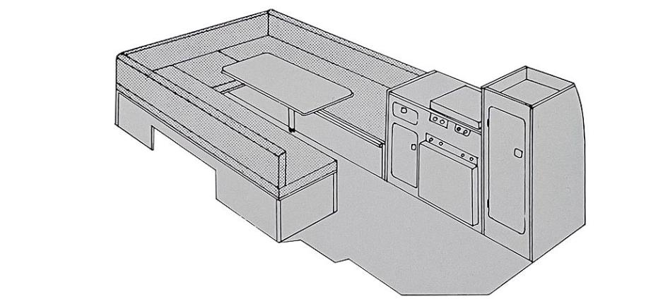 Ønsker du en enkel innredning i en varebil hvor du beholder skilleveggen, kan det gjøres på flere måter. Denne løsningen gir en romslig sittegruppe og en stor dobbeltseng. Å kunne sitte bekvemt ved et bord innendørs er viktig for komforten. Hvis du legger ned bordet og setter inn en ekstraplate, og deretter legger på ryggputene, får du plutselig en god seng i full lengde og bredde. Denne løsningen kan forresten fungere like godt på biler uten skillevegg.