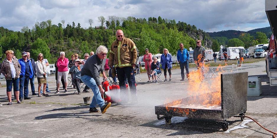 Det er ikke bare kos, men også litt alvor på disse treff-dagene i mai. Notodden Brann og Feiervesen stilte opp med viktig informasjon og utstyr for en praktisk brannøvelse.