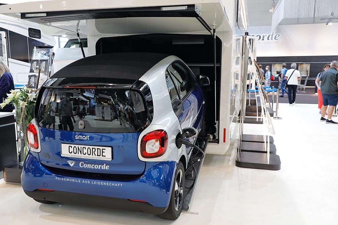 Selvsagt skal en bil ha garasje, tenker du kanskje. Det syntes åpenbart mange av utstillerne av store linere under Caravan Salon-messen i august. I hall 5 var det nemlig en overflod av stooore bobiler med plass til en ekstra personbil ombord.