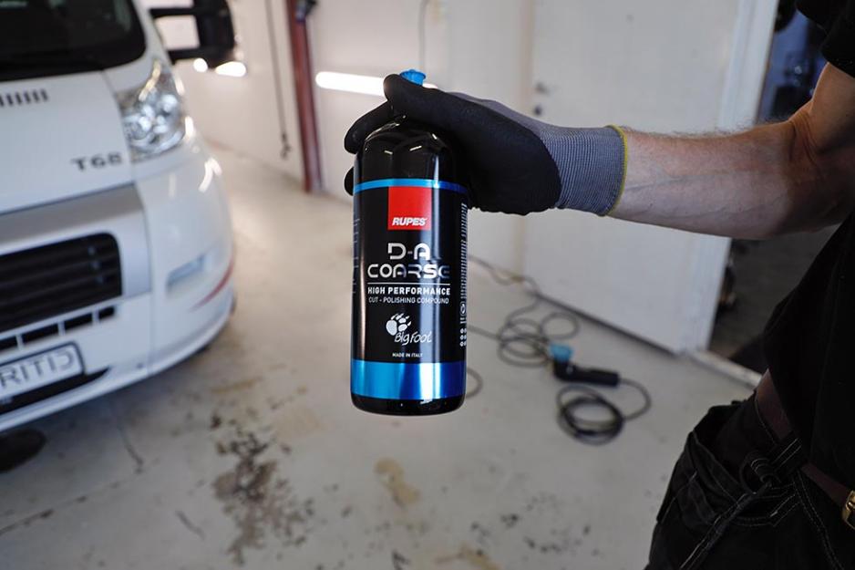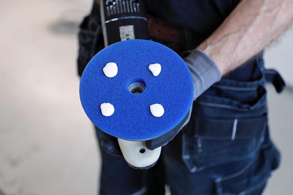 Det finnes flere ulike typer poleringsputer til poleringsmaskiner. I prinsippet bruker man hardere pute jo mattere lakken er. Har du et godt utgangspunkt kan du med andre ord bruke en myk pute. Ofte har en bobil langt blassere front enn sider, for eksempel. Så gjør gjerne en vurdering av det før du begynner. I vårt tilfelle er fronten, panseret og skjermene blasse. Her finner Christian fram en ny middels myk pute. Puta får fire små prikker med alt-i-ett rens og beskyttelse. Ikke bruk for mye, er Christians klare oppfordring: Da risikerer man bare at overflødig polish griser ned bilen. Hovedregelen er: Fire «erter» på en ny pute, og når pusseskiva er innkjørt, skal man kun bruke to erter. Da blir det lettere å tørke av bilen senere, og rengjøringsjobben av selve puta blir også langt enklere.