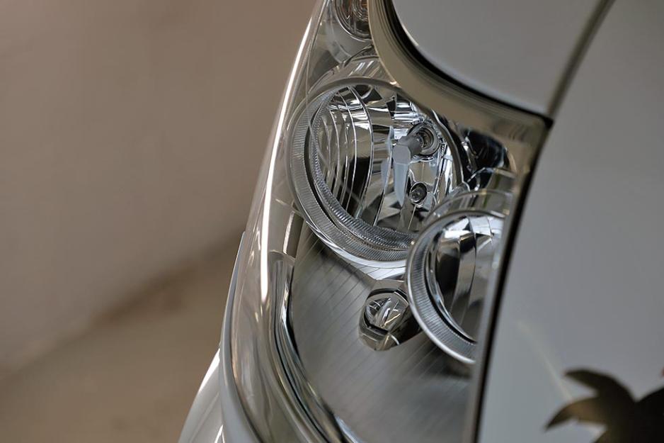 Det er ofte fronten som er mest utsatt på en bobil. Det er her en god polering er viktigst og mest synlig. Derfor begynner Christian alltid foran på biler. Før du starter poleringsmaskinen, anbefaler han å starte den på laveste hastighet. Og like viktig, man holder maskinen helt rolig de første omdreiningene. Da setter middelet seg i puta, og spruter ikke rundt omkring. Etter noen sekunder kjører han opp hastigheten på maskinen og kjører den rundt i et minutts tid, før det er på tide med påfyll av polish.