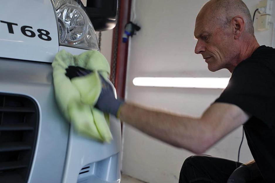 Nyvasket og tørr bobil eller vogn er vårt utgangspunkt. Det er mange fordeler med å stå innendørs. Det har dessverre ikke alle mulighet til. Står du utendørs er det viktig å unngå sollys. Det gjelder både når man vasker og polerer, forteller Christian. På hans arbeidsplass er vaskeplassen og poleringsplassen i to ulike haller.