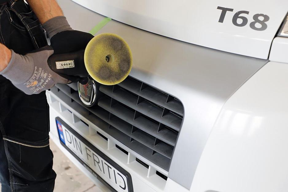 Før polering er et smart tips å bruke maskeringsteip på plastdetaljene. De vil ellers få varige merker av poleringsmiddel eller lakkrensemiddel, forteller vår ekspert. Han teiper plastlisten rundt vinduene, dørhåndtaket og overgangen til plastdetaljer i grillen.