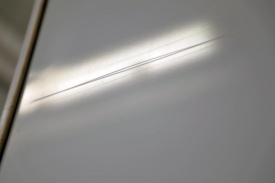 Kort tid etter gjentas prosessen på veggen, med samme resultat. Det er mulig å ane hvor ripene er, om man ser nøye, men i praksis er de ikke lenger synlige.