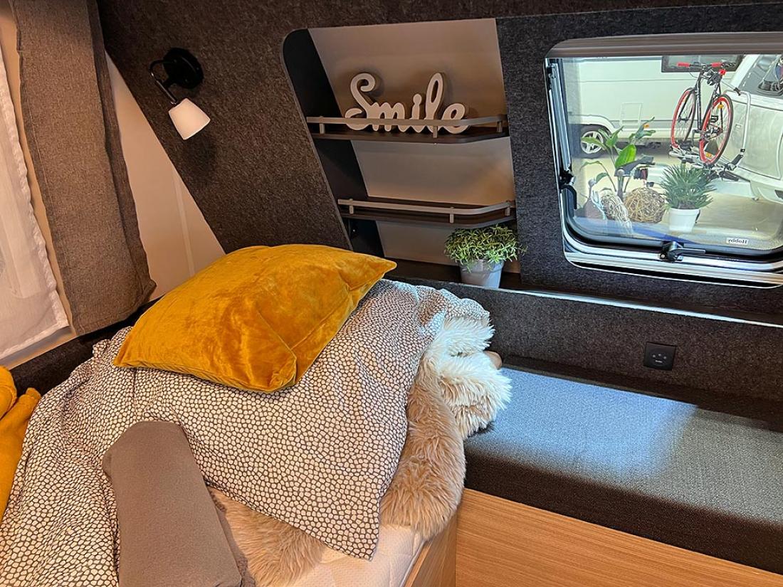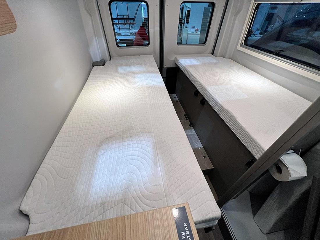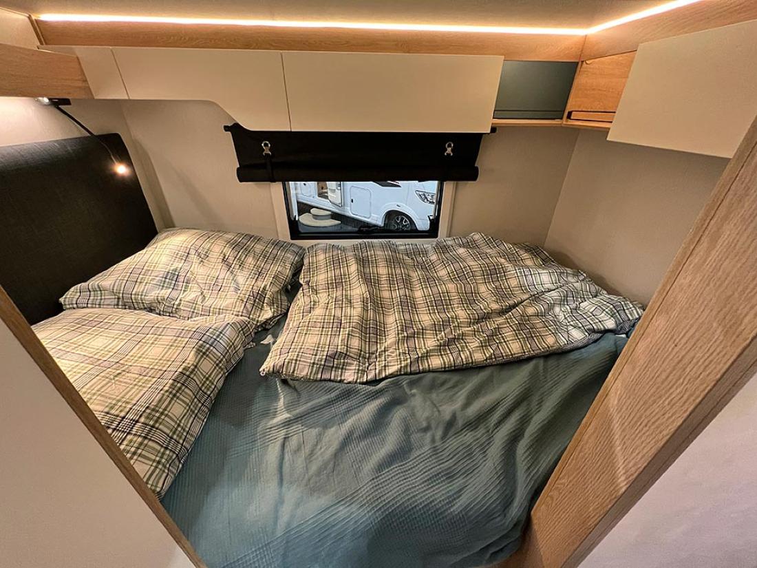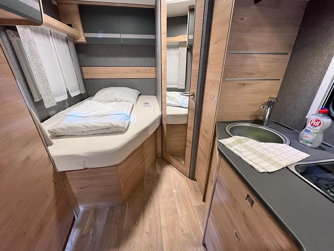 Det å ha hovedsengen og badet parallelt var tidligere en populær interiørløsning på bobiler. Det er en plasseffektiv løsning, selv om sengen har en tendens til å bli smal. På messen viste Dethleffs fram en ny modell med nettopp fransk sengeløsning i den Ford-baserte serien Just Go. Modellen T 6905 FB kan i tillegg utstyres med senkeseng. Den 699 cm lange bobilen oppleves som luftig innvendig. Det skyldes nok interiørløsningen, takhøyden på 213 cm og at den er i «full bredde» med sine 233 cm. Vi testet enkeltsengmodellen Dethleffs Just Go T 7055 EB i forrige utgave.