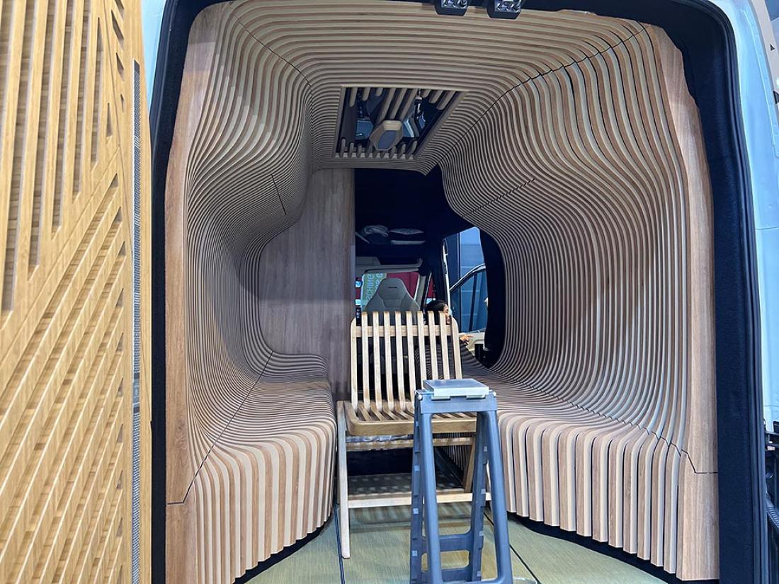 Er det messe skal det høres og synes, tenkte nok lydanlegg-produsenten Alpine. De har fått spesialinnredet en bybobil med en innvendig trekonstruksjon, som vi tipper er mer imponerende enn nyttig i en praktisk bobilhverdag.