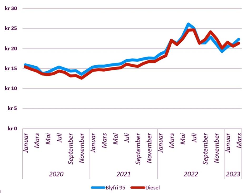 De siste tolv månedene har snittprisen på både bensin 95 oktan og diesel mange måneder vært på over 22 kroner. Ferske tall fra SSB viser at prisene for både bensin og diesel steg fra februar til mars.