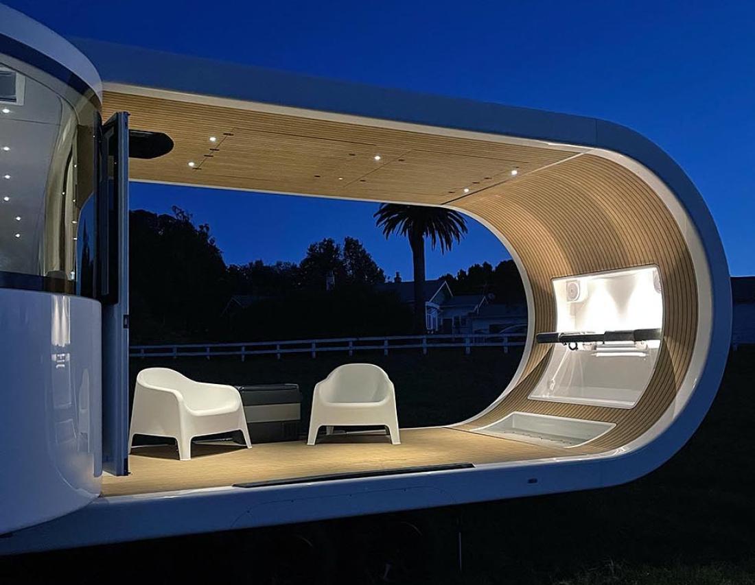 Romotows konstruksjon er derimot høyst moderne, og har tatt idéen om å lage ekstra plass når du har parkert et stort skritt lenger. For når støttebena er nede på denne vogna kan du ved å trykke på en knapp folde ut innmaten i denne kreasjonen av en campingvogn. Resultatet er at du får nesten 27 kvm med vogn og uteplass i en 90-graders konstruksjon. Det blir nesten som et lite tun.