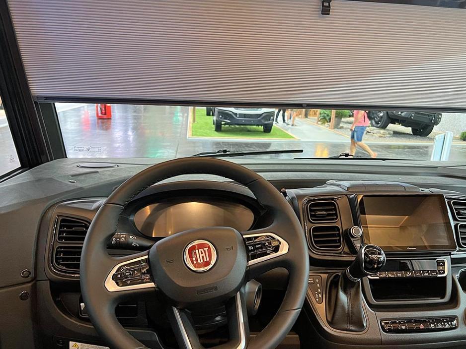 Dette var en testbil og jeg konfronterte naturligvis produsenten av bobilen da jeg kom tilbake til fabrikken. De tok øyeblikkelig bobilen inn til kontroll for å se nærmere på problemet. Det ble tydelig at en slik feil kan oppstå, og gardina ikke blir plassert helt riktig i låsen. Det er ingen ekstra sikring, som forhindrer at gardina kan skli helt ned og dekke til hele frontruta. Frontgardinen var montert i en helintegrert Itineo, men også andre produsenter benytter den samme gardinen som lages av en underleverandør.