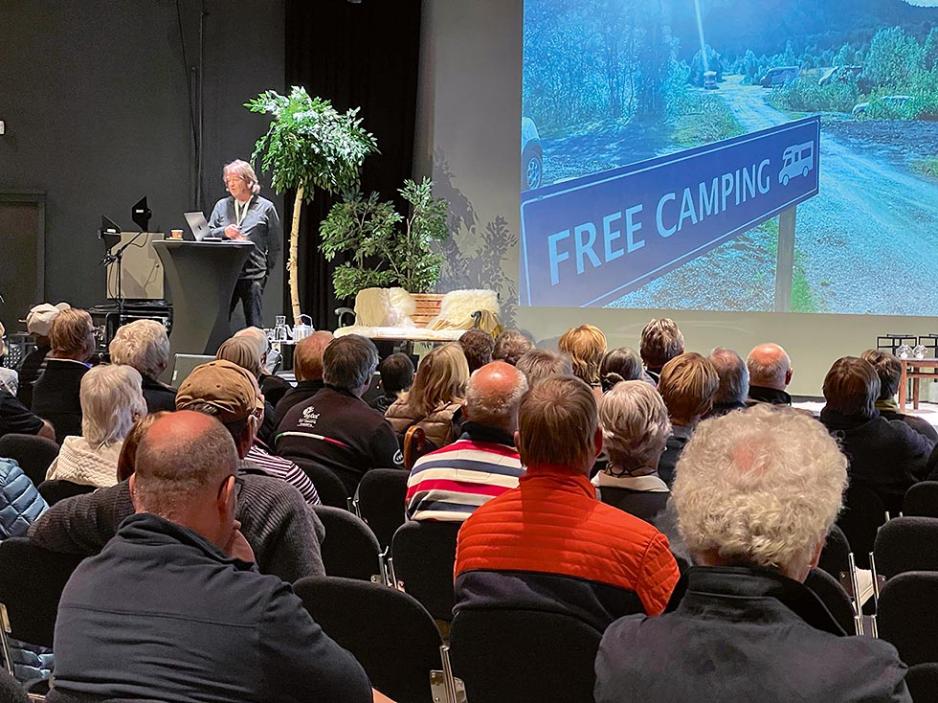 POPULÆRE FOREDRAG: Per Vie (under) fortalte om sine bobilturer og opplevelser både torsdag, fredag og lørdag, og Harald Rønneberg delte av sin livsglede og livsmot på fredagens seminar med nærmest fullpakket sal.