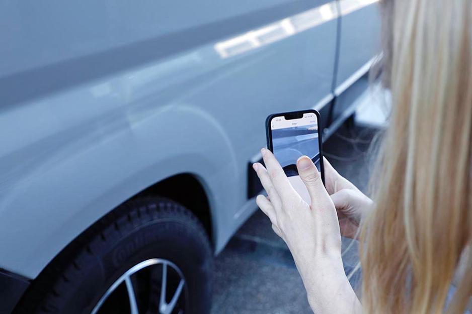 Underveis i overleveringa veileder Campr-appen oss gjennom det å dokumentere skader på bobilen. Bilder blir tatt av skaden på bordet, og en tydelig utvendig ripe.