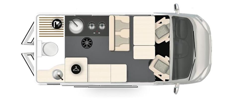 Totalt byr modellen på fire sove- og sengeplasser hvor hovedsengen er en elektrisk senkeseng i front. Her er noen flere stikkord: Elektrisk dobbel senkeseng, XL sikkerhetsdør, sidesittere med Isofix og justerbart bord, nedfelt vask og 3-bluss kokeapparat med elektrisk tenning, kjøkkenvifte, 150 l kompressorkjøleskap, høyttalere i bodelen, bad med separat, ekstra stor dusj og belyst speil, stor lounge bakerst, stor bakre lasteluke og oppbevaringsplass under sofaen.