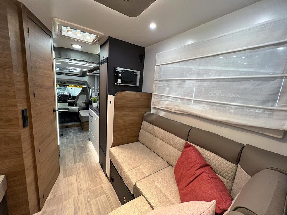 Hvem drømmer vel ikke om å ha med seg en romslig sofa i bobilen på tur? Det kan du i Mileo 282. Det er rett og slett en rundsitter av en luksussofa bakerst i denne modellen, som Benimar kaller en First Light Edition.